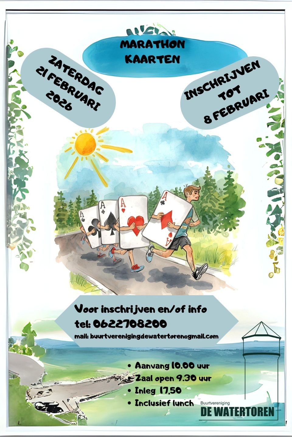 Op 21 februari organiseert Buurtvereniging De Watertoren een gezellige marathon kaarten in Buurthuis De Aanlegsteiger aan de Vissersdijk 30 in Gorinchem.