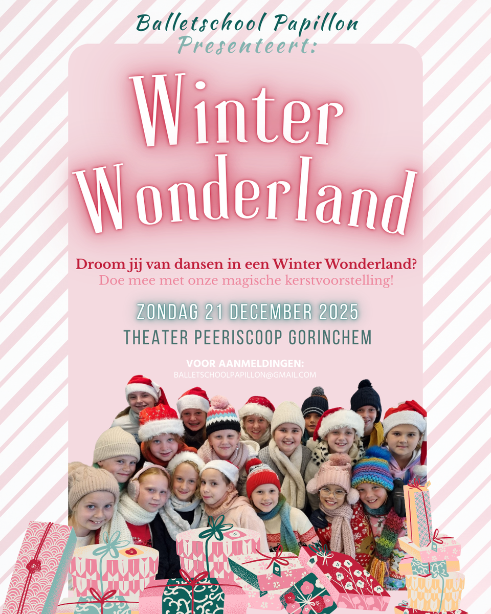 Stap binnen in een magisch winterse wereld tijdens deze feestelijke voorstelling. Onder leiding van Anja Rietveld brengt Balletschool Papillon een sprankelende show vol hoogtepunten uit geliefde kerstmusicals zoals ‘Elf’, ‘Annie’, ‘Oliver’ en andere hartverwarmende winterverhalen.
