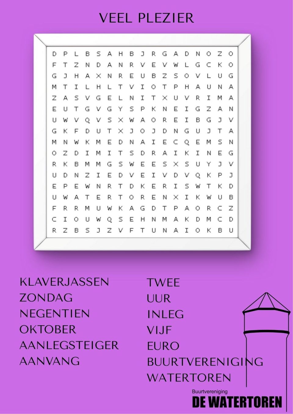 Buurtvereniging De Watertoren nodigt je van harte uit voor een gezellige middag klaverjassen!