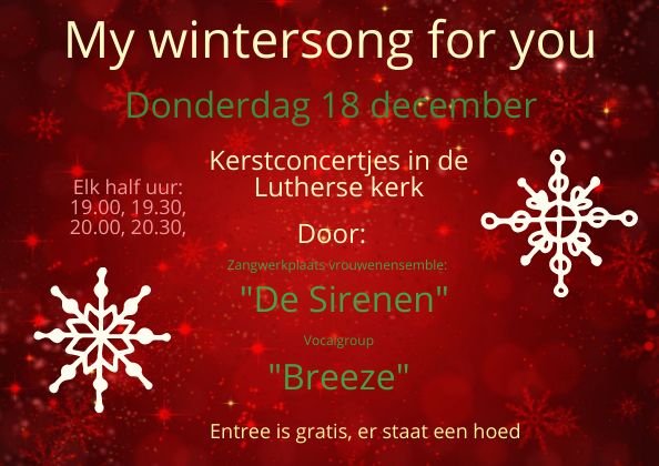 Op donderdagavond 18 december kunt u in het prachtige Lutherse kerkje aan de Langedijk luisteren naar kerst en wintermuziek. Het vrouwenensemble “De Sirenen” van Zangwerkplaats Gorinchem en Vocalgroup “Breeze” laten hun stemmen horen in de fantastische akoestiek van de schuilkerk op nummer 72. Speciaal voor het winkelend publiek is er Vanaf 19.00 uur elk half uur een kwartiertje muziek. De toegang is gratis, er staat een hoed voor een donatie.