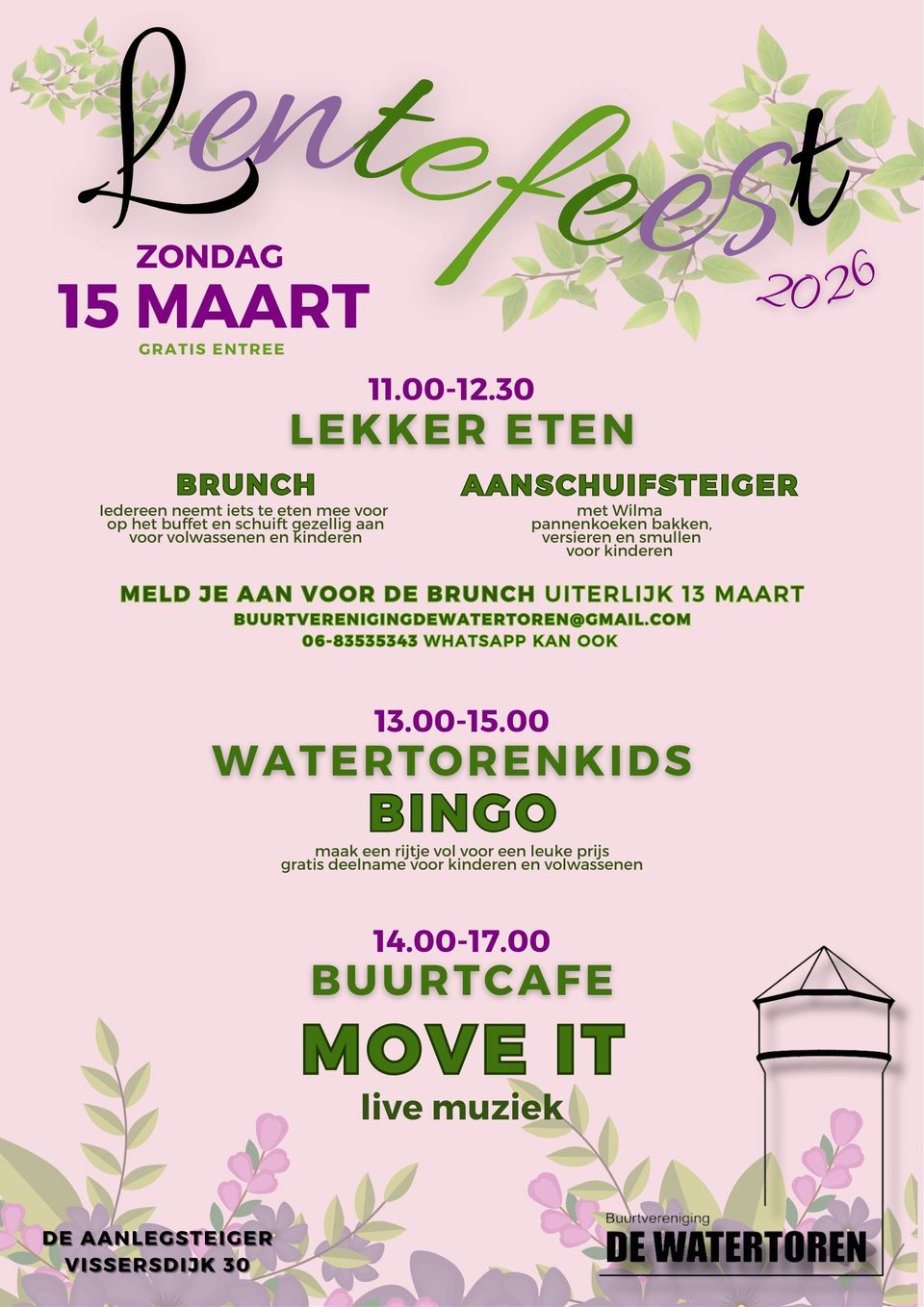 Zondag 15 maart organiseren de Buurtvereniging De Watertoren het jaarlijkse Lentefeest (toegang gratis). Eerst met elkaar brunchen en pannenkoeken bakken met de kinderen, daarna is het voor de liefhebber mogelijk om een leuke prijs te winnen met de bingo. Vanaf 14.00 uur kan er genoten worden van live muziek van Move it. Dit alles voor jong en oud. Zie de poster voor het programma en als je meedoet met de brunch vragen we je om uiterlijk 13 maart aan te melden zodat we weten hoeveel borden we klaar kunnen zetten. Mocht je ook al weten wat je mee neemt naar de brunch wil je dit dan doorgeven bij de aanmelding. Wij hopen jullie te zien op zondag 15 maart!