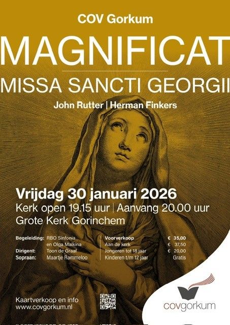 Vrijdagavond 30 januari 2026 voert COV Gorkum het Magnificat van John Rutter en de Missa Sancti Georgii van Herman Finkers uit in de Grote Kerk van Gorinchem. De aanvang is om 20.00 uur. Van harte welkom!