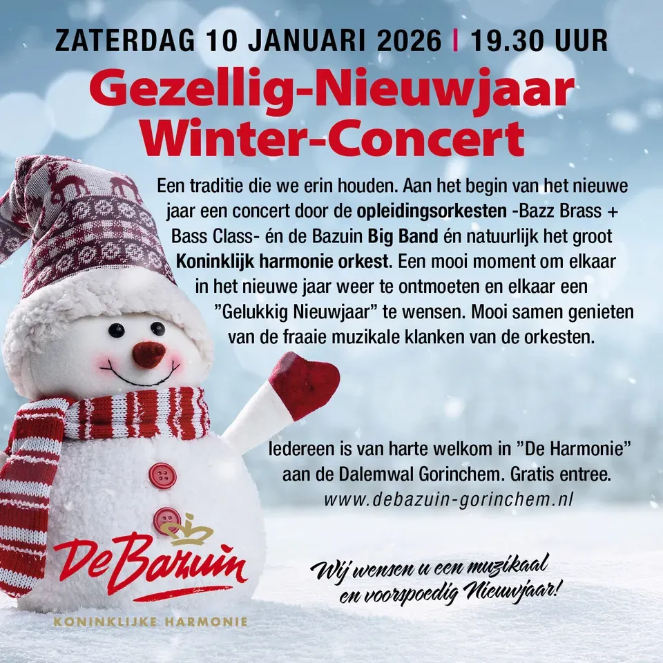 Luid het jaar muzikaal in met het traditionele Nieuwjaarsconcert van Koninklijke Harmonie De Bazuin. Een avond vol warme klanken en samenzijn, waarbij we het nieuwe jaar feestelijk en in stijl beginnen.