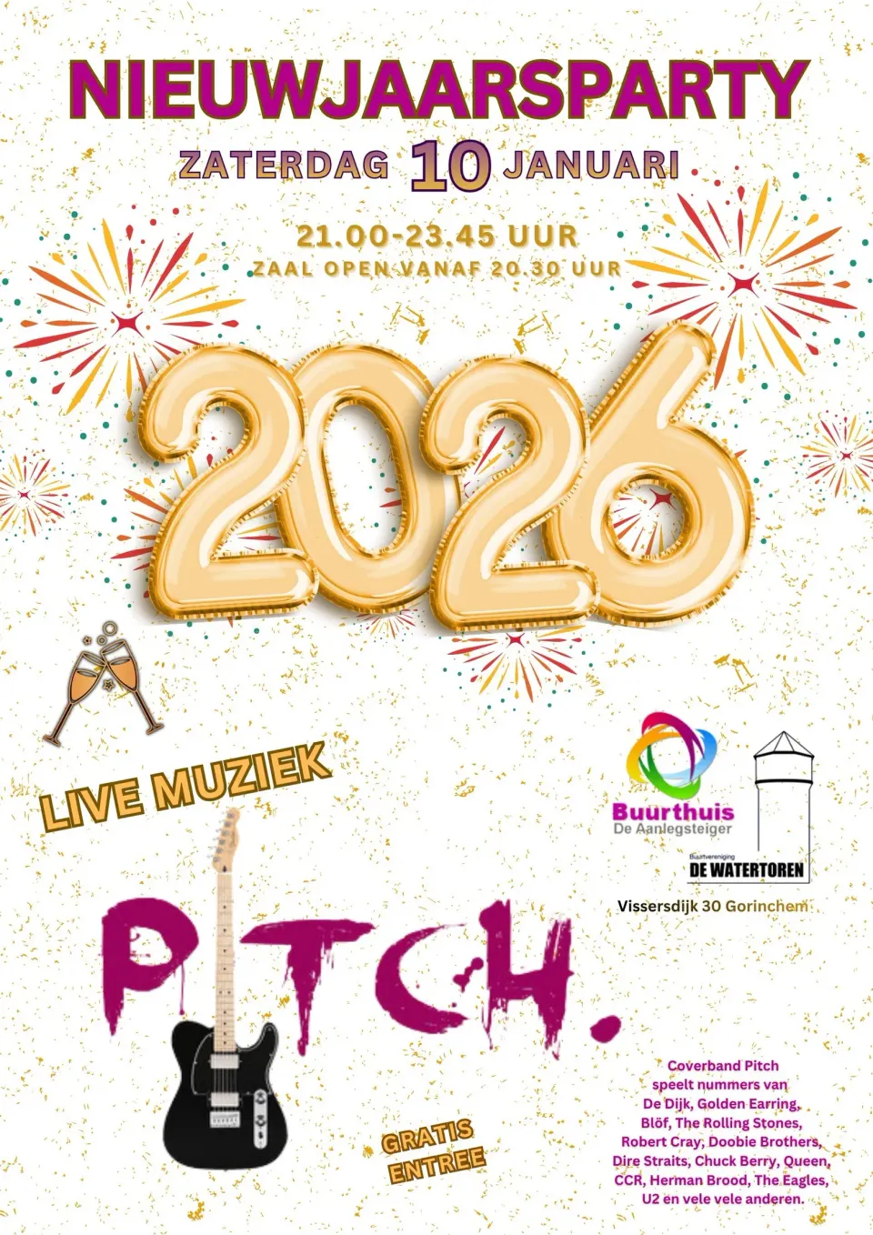 Buurtvereniging De Watertoren en Buurthuis De Aanlegsteiger organiseren een feestelijke Nieuwjaarsborrel met live muziek van coverband Pitch. Dans, proost en geniet van een gezellige avond vol klassiekers van onder andere De Dijk, Bløf, Queen en meer.