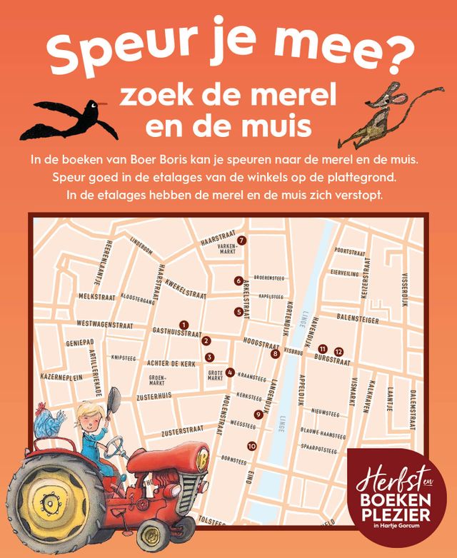 Voor de jongste bezoekers is er bovendien een speurtocht: ‘Speur je mee? Zoek de merel en de muis’. In de etalages van winkels in Hartje Gorcum hebben deze dieren zich verstopt. Wie goed zoekt, ontdekt de leukste plekjes van de stad.